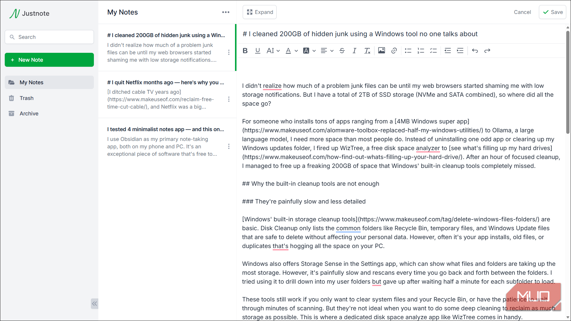 하지만 저에게는 두 가지 결정적인 단점이 있습니다. 첫째, Notally는 입력 또는 내보내기에 마크다운을 지원하지 않습니다. Obsidian과 같이 마크다운 기반 워크플로를 사용하는 경우 앱 간에 메모를 이동하려면 추가 변환 단계가 필요합니다. 둘째, Android 전용이며 웹 또는 데스크톱 버전이 없으므로 모든 장치 간의 워크플로에서 사용할 수 없습니다. Android만 사용하고 마크다운이 필요하지 않으면 Notally가 좋은 선택입니다. 하지만 저에게 맞는 앱은 아니었습니다.