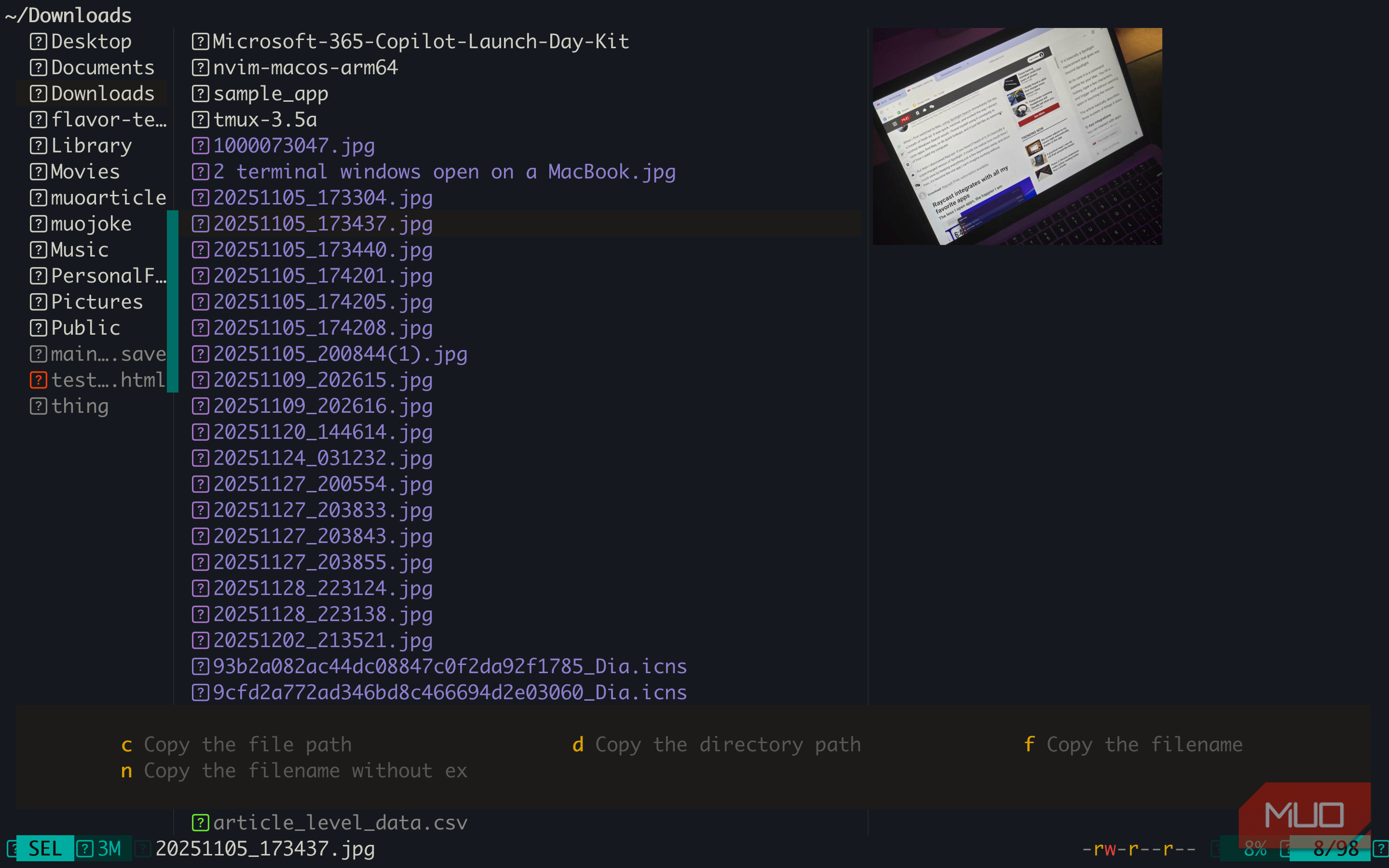 저의 개인적인 “기술 철학” 중 하저는 키보드만 사용할 경우 훨씬 더 빠르게 작업을 완료할 수 있다는 믿음인데, 마우스는 일반적으로 속도를 늦출 뿐입니다. 물론 대부분의 앱이 마우스 입력을 중심으로 구축되어 있기 때문에 항상 실용적인 것은 아니지만 Yazi는 옛날 터미널 마인드를 고수합니다. 원한다면 절대적으로 모든 작업을 키보드로 할 수 있습니다.