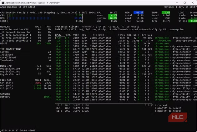 Glances는 브라우저를 추상화된 “탭” 또는 “작업”이 아닌 실제 시스템 프로세스의 집합으로 감시합니다. 현대 브라우저가 얼마나 방대해 보이는지 처음으로 볼 수 있는 기회를 주었습니다. 단일 탭은 여러 렌더러 프로세스, 유틸리티 프로세스, GPU 도우미 및 병렬로 작동하고 일반적으로 브라우저의 작업 뷰에 표시되지 않는 네트워크 스레드를 시작할 수 있습니다.