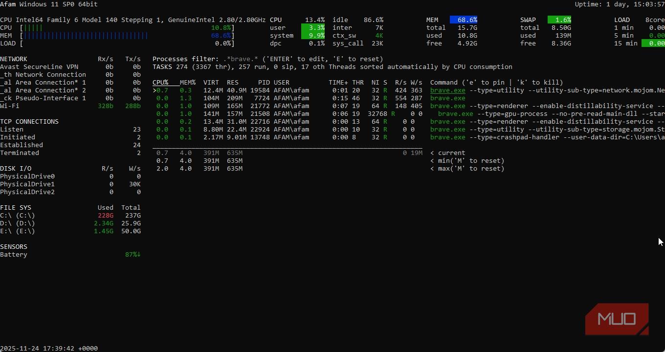 오픈 소스 Glances 도구를 사용하기 시작했고, 중요한 세부 사항을 모호한 범주로 압축하는 대신 모든 하위 프로세스, 도우미 및 백그라운드 작업을 보여줍니다. 이 수준의 상세한 브라우저 활동을 본 후 진정으로 가벼운 브라우저는 무엇인지 이해하게 되었고, 필터링된 현실에서 벗어나게 되었습니다.